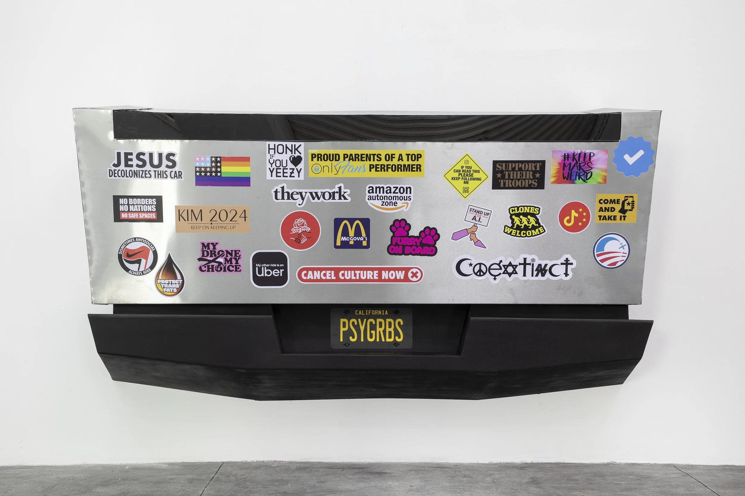 A reconstruction of a Tesla Cybertruck's trunk and imagined bumperstickers